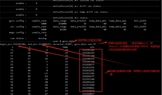 5.1、测试所用的陀螺仪型号为iim42652,采用fifo模式读取数据。当采样率设置为1000Hz时,若数据读取间隔为5ms,间隔时间过长会导致陀螺仪数据缺失——此情况针对hi3516dv500芯片的数据获取场景,不同芯片的表现存在差异,需依据厂家提供的说明进行配置。测试过程中,配置的读取间隔为50ms,帧间隔为33ms,每次仅能获取部分数据,后续间隔50ms内的数据尚未完成读取。