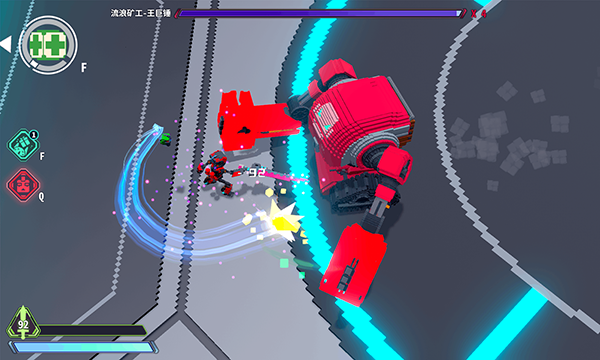 技能1:向前冲刺并挥剑攻击。这是果冻号最基础的技能,也是它登场后最先使用的技能。小伙伴们只要注意保持一定距离就能轻松闪避,因为它突进的距离不算特别远,所以闪避起来难度不大。