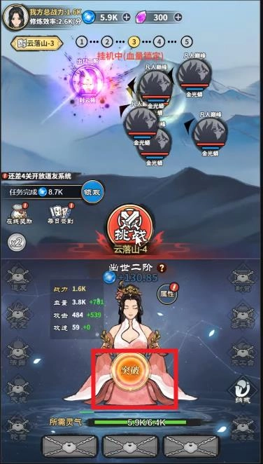 3、当你积累了足够的真气后,就可以点击突破按钮,这样就能在游戏里持续突破自身实力,不断提升各项能力。