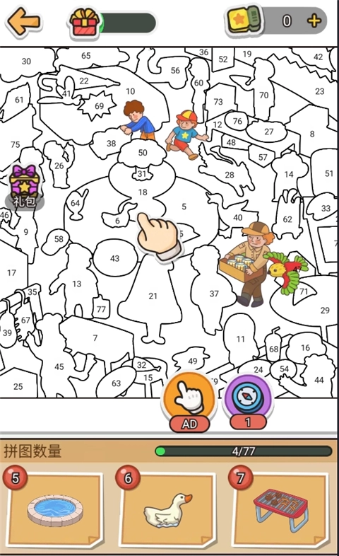 3.点击贴纸:在游玩关卡模式时,点击碎片框内的贴纸,该贴纸会以真实尺寸显示出来,你可以依据这个大小比例,在图中定位到它的大致位置。