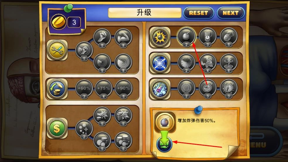 1、打开升级界面,花费金币升级各类技能,增强防御塔的性能,为即将到来的战斗做好充分准备。
