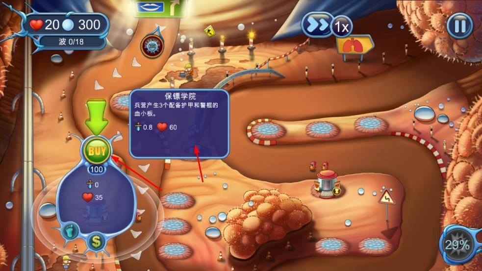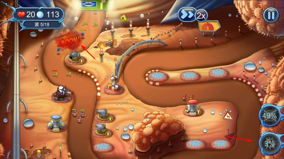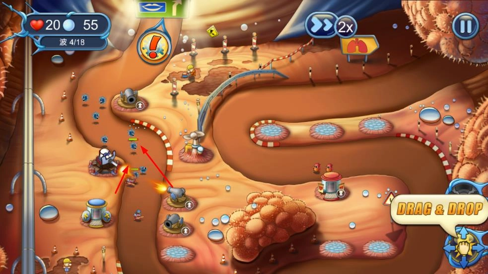 游戏内设有血球攻击塔、血小板兵营、巨噬细胞塔和抗体辅助塔等常见塔型,不同塔型具备各异功能,玩家能依据入侵者的特性灵活挑选建造,打造出多样的防御组合。
