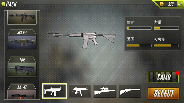 3、玩家需依据需求挑选枪械,点击SELECT即可进入游戏开始游玩。