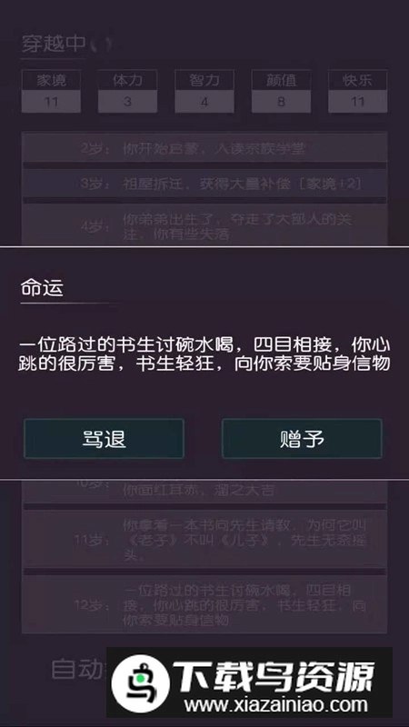 在一个奇妙的机缘下,你意外穿越回古代,开启另一段人生旅程;这款模拟游戏让你自由选择初始属性,进入充满未知的时空,体验从平民到名士的百变命运,每一次抉择都可能改写历史轨迹;文字叙述细腻生动,几个小时就能走完一段人生,结局却千变万化;喜欢这种穿越奇遇的话,就在本站吧!