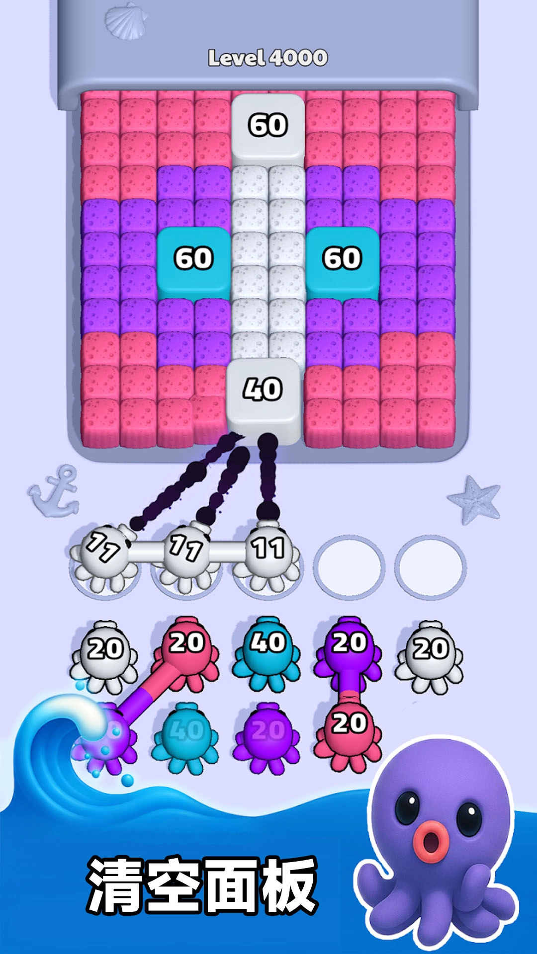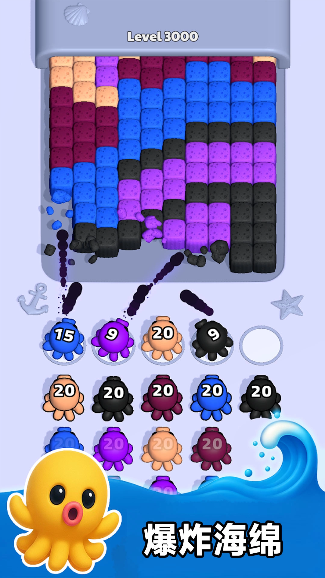 3、依次切换不同颜色章鱼,逐步清理剩余海绵,利用墨水二次碰撞效果触发连锁消除,提升效率。