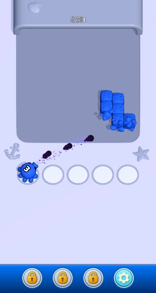 2、观察关卡内海绵分布,选择对应颜色的章鱼,瞄准同色海绵释放墨水,击碎首批同色目标。