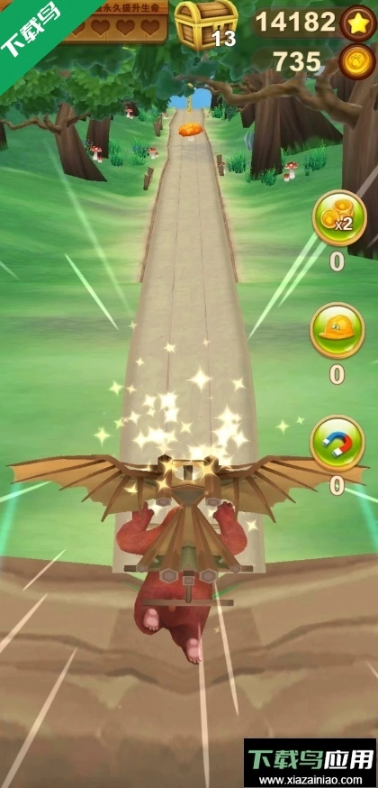 1、使用手指在屏幕上左右滑动,就能指挥熊大灵巧地躲开各种障碍;向上滑动可令角色跳跃,向下滑动则能做出滑铲动作。