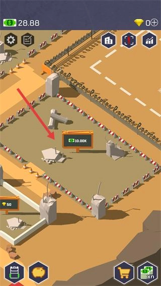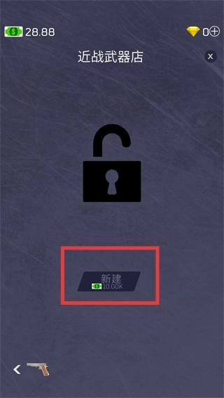 1、点击标有【10.00K】的区域,进入【近战武器店】界面,可解锁该建筑的功能。