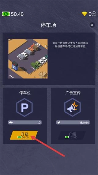 4、在【停车场】界面,消耗【50.00】资源点击【升级】按钮,提升【停车位】的承载能力。