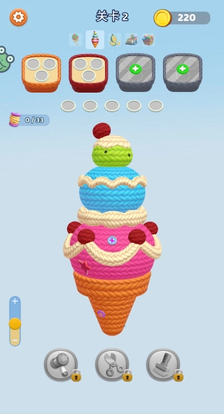 3、有数量有限的暂存格,用来放一时没办法分类的毛线,如果格子全满又没地方可放就会闯关失败。