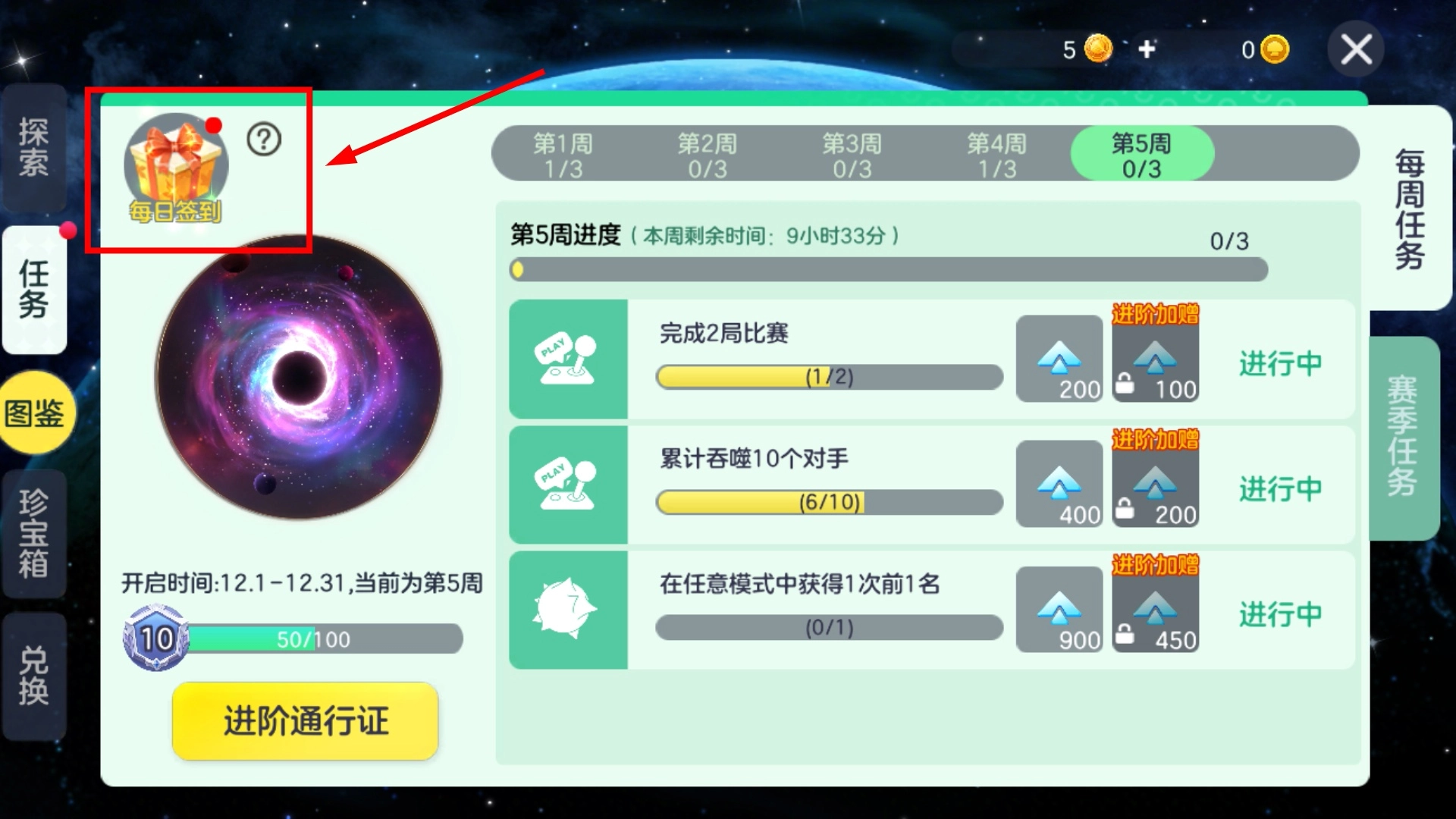 3、进入任务界面后点击【每日签到】拿奖励,同时可查看每周任务的进度情况。