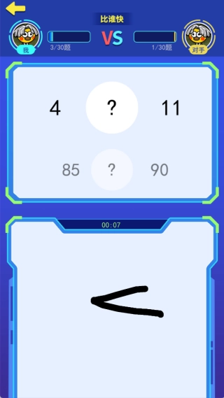 2、在下方进行画线,玩家要快速对比两边数字的大小,答对题目就能提升比赛进度。