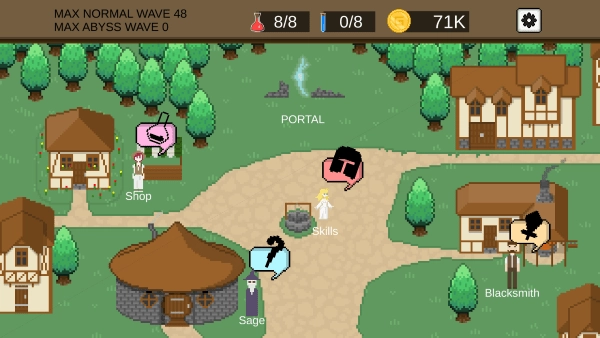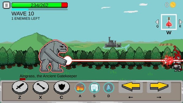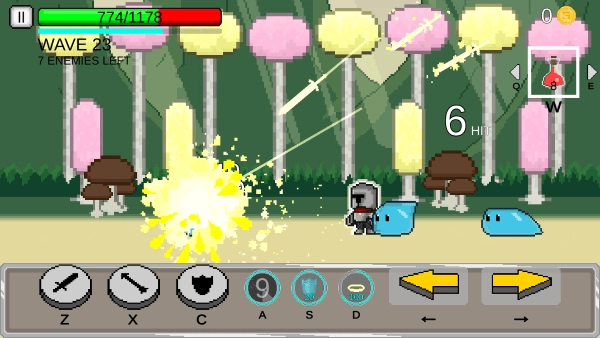波次闯关:通过点击传送门(portal)进入关卡,左侧的操作键用于控制角色移动,右侧则可进行长剑攻击、弓箭射击、开启防御等操作。坚持的波次越多,敌人的强度就会越高,玩家需要生存到最后,才能挑战最终的BOSS。