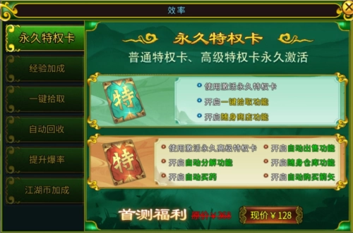 想不想解锁专属福利?首次测试期间入手永久特权卡超划算,能开启自动挂机模式,彻底解放双手!不仅支持一键捡物、一键售卖回收,还配备了随身商店、移动仓库,以及自动采购道具的便捷功能,激活后就能终身享用!