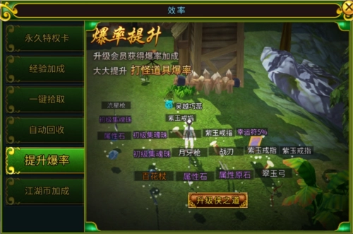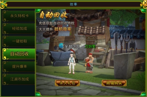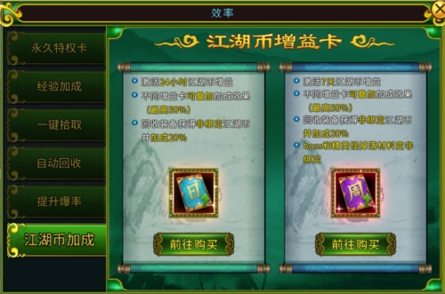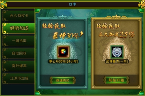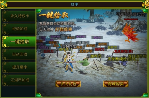 觉得逐个收集物品太繁琐?不妨试试一键收取功能!特权卡获取方式灵活,除了直接购买,还能在商城用元宝或江湖币兑换,让打怪升级更高效!