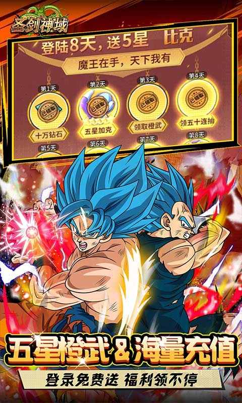 连续八日登录游戏即可领取丰厚福利:五十次召唤机会、五星品质的比克大魔王角色、强力橙色武器以及大量钻石奖励,助力玩家轻松开启游戏强势开局!