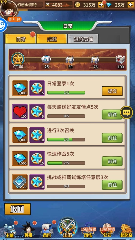 完成新手指引后,每日任务就会解锁,按照任务提示去执行,能够获取丰富的经验。