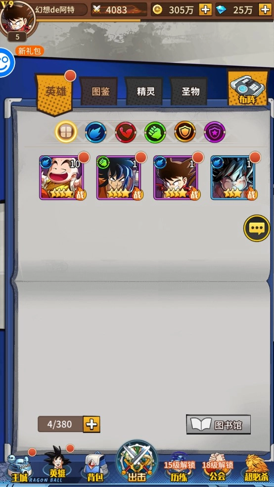 最强阵容三:超赛神悟空、邪念波、超赛神贝吉塔、贝吉塔·超蓝与老界王神。