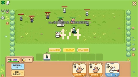 击败敌人后会得到金币与经验,金币可用于升级、刷新以及购买新的猫meme角色。