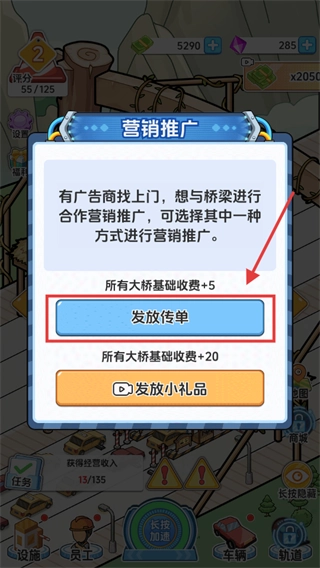 在进行营销推广时,选择【发放传单】这一方式,无需观看广告就能使所有大桥的基础收费增加5,从而提升收益。