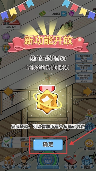 当评分达到60分即可解锁【成就】功能,点击【确定】按钮可关闭当前提示,后续还能借助成就系统来提高大桥的收费金额。