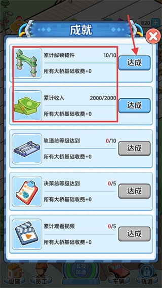 在成就页面,点击已完成成就旁的【达成】按钮,领取对应的奖励,这样就能提高所有大桥的基础收费标准。