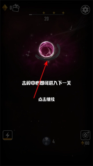 按照提示击碎中心就能进入下一关,击碎星球区域后,完成关卡挑战并进入下一关。