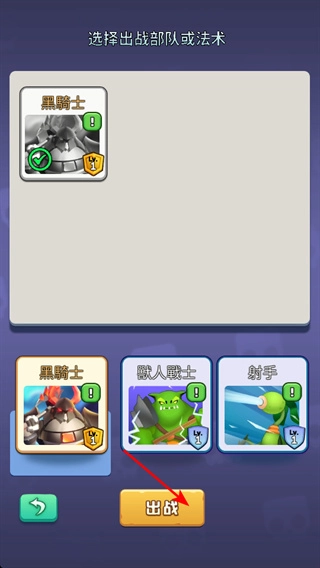 在部队选择界面挑选出战单位,选定黑骑士与兽人战士后,点击出战按钮即可进入战斗。