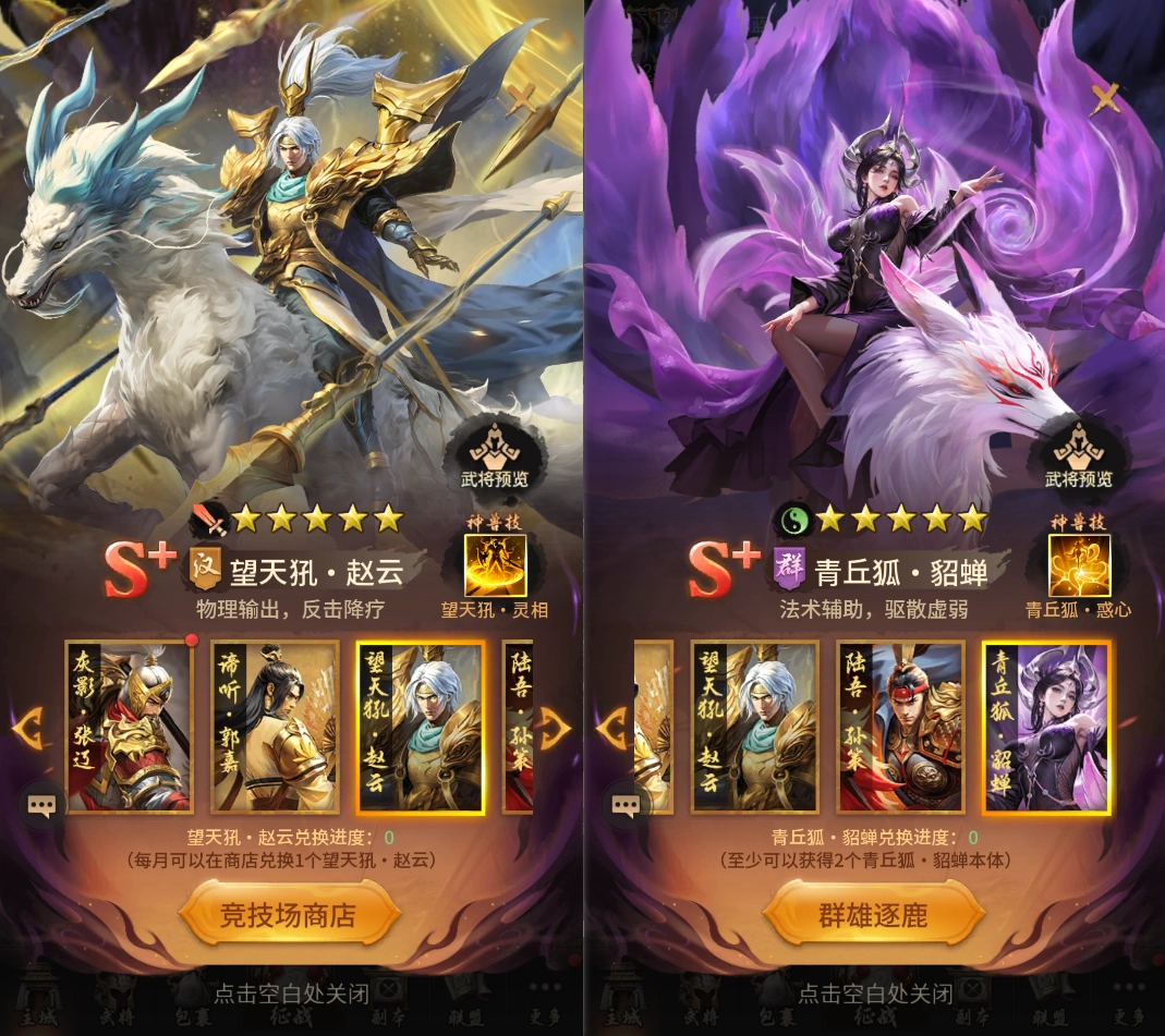 参与群雄逐鹿对抗竞猜活动有机会获取S+品质的青丘狐·貂蝉,并且保底能得到2个貂蝉本体。