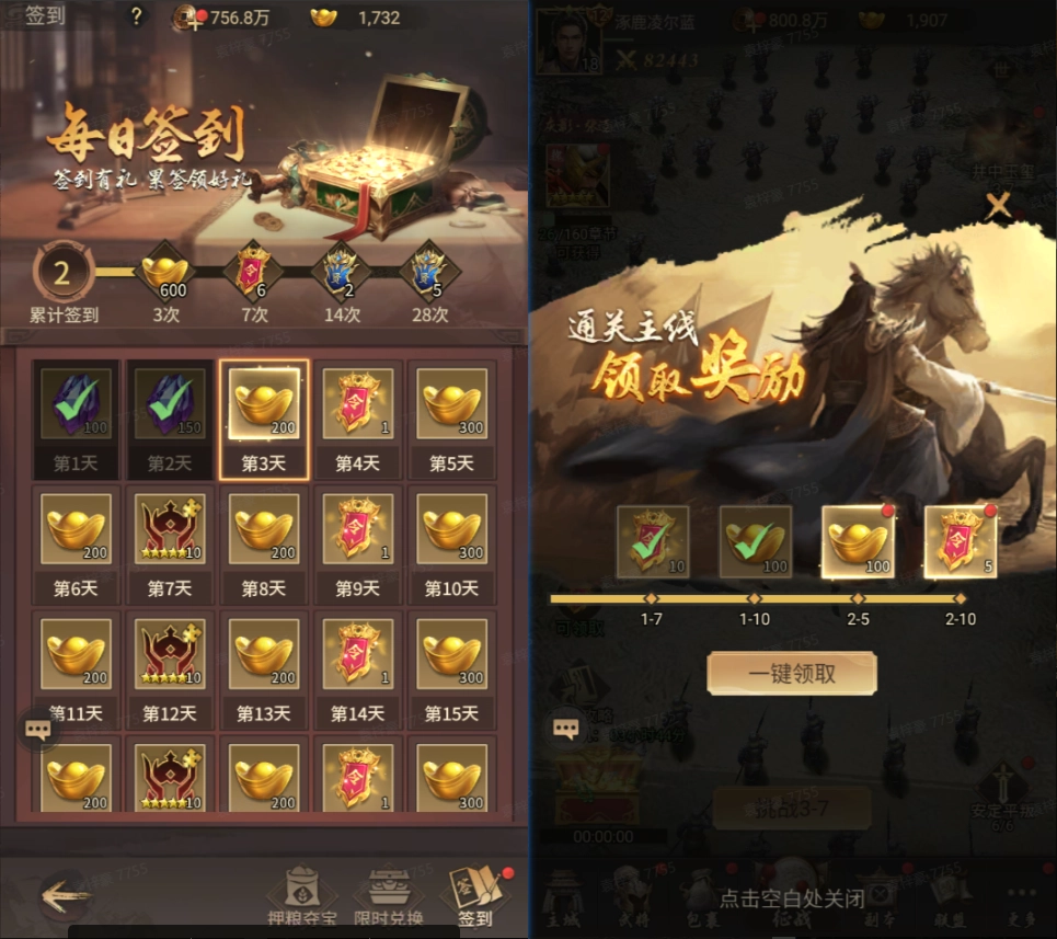 活动期间,只要完成每日签到与主线通关,就能领取海量元宝、升星石、招募令、五星武将碎片等超值奖励!常言道“三军未动,粮草先行”,丰富福利将助主公披荆斩棘、战无不胜!