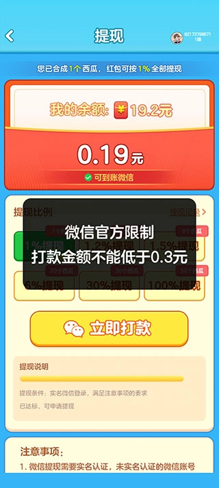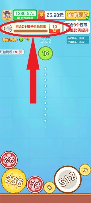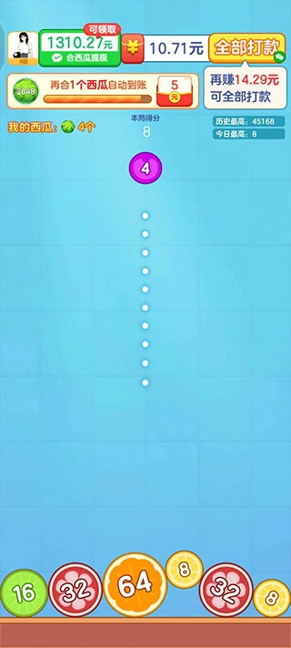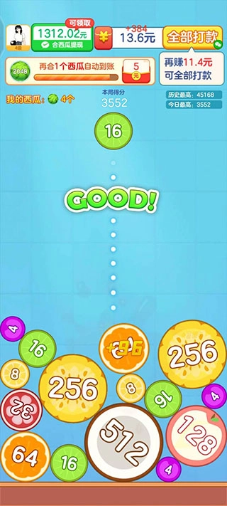 PS:合出大西瓜红包版,玩家在游玩过程中能拾取随机掉落的红包奖励,等红包奖励积累到一定数量后就可以提现啦!