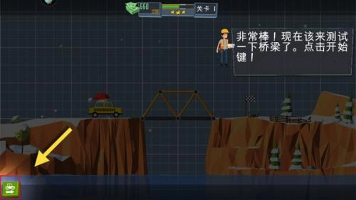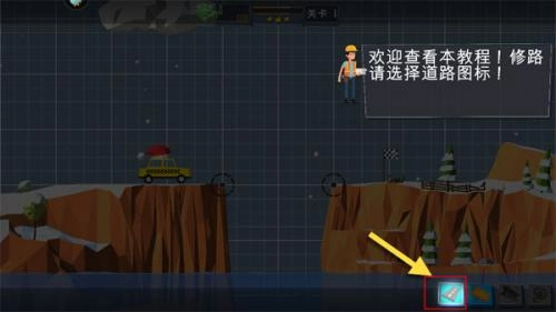 打开游戏后会出现一个开启按钮,点击该按钮即可进入搭桥铺路的游戏关卡界面。此时会有新手教程引导,修路过程中请选择道路图标进行操作。