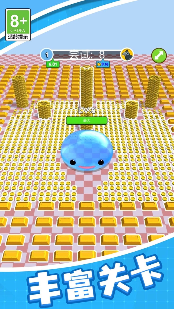 道具系统:关卡中会随机出现加速、分裂等特殊道具,合理使用可事半功倍。