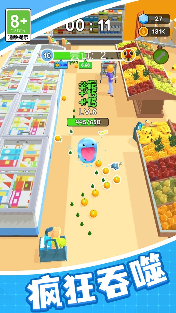萌趣角色设计:主角蓝色史莱姆造型可爱,表情丰富,吞噬时的动作生动有趣,带给玩家愉悦的视觉体验。