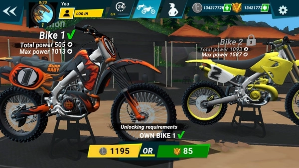 1、在本站找到并打开疯狂技能越野摩托车3汉化版游戏,进入游戏主界面后,点击黄色按钮即可开始比赛。