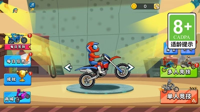 1、可以随时开启游戏,解锁各式各样的摩托车,尽情享受驾驶的乐趣。游戏风格简约,内容却十分丰富,卡通元素为玩家带来了充满欢乐的体验。