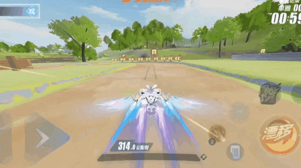 上坡时通过左右小幅度调整方向穿过连续的假弯,随后用小漂衔接CWW喷的方式通过直角弯;等上坡路段抵达坡顶后,向右侧漂移并把车头对准左侧树林近道,同时完成氮气延续。过程中要留意路线的选择,只要对准两排树林的中间位置就行。