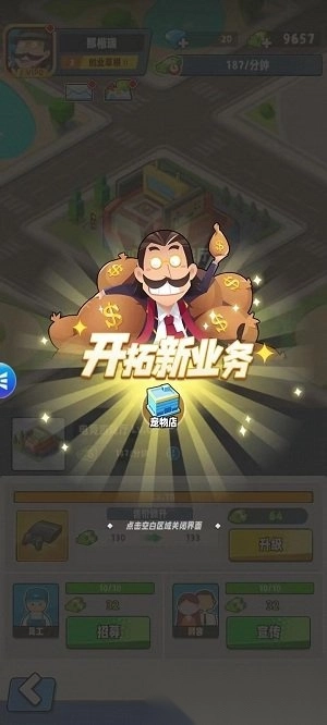 2. 覆盖水果店、零食店、电影院、美容院、医院等多个领域的建筑商铺,可供你自由经营以获取盈利。