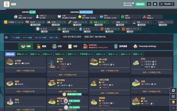 别的话不多说,这里单独要聊的是那个“嘀”——也就是tick的奇怪翻译。城镇的时间不会自动流逝,得消耗tick来手动操作;所有资源项在储量后面都标注了每tick的增量,消耗tick后资源就会相应增减。需要特别注意你的仓储,要是仓储堆满了还消耗tick,资源就会浪费,所以得及时扩大仓储容量,或者消耗、丢弃多余的资源。tick会随着现实时间的推移自动获得,获取速度和你城镇的发展水平是正相关的。