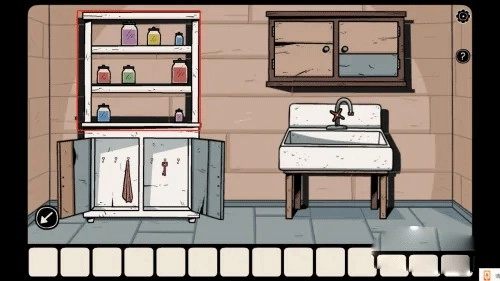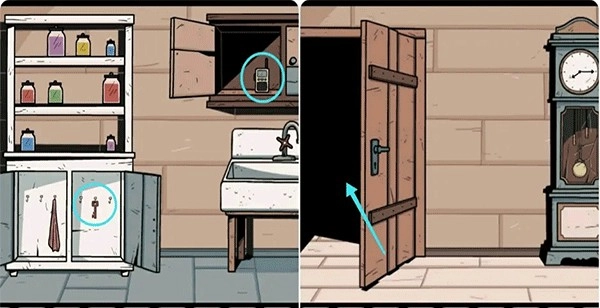 打开蓝色的门进入盥洗室,按照片上的提示摆放架子上的罐子,完成后拿走下面的钥匙,接着打开水池上方的柜子拿到对讲机,然后出去用钥匙打架钟表左侧的门。