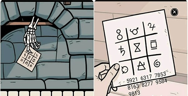 来到壁炉那里掀开画框上的白布进入剧情,接着对壁炉使用对讲机收到一张纸条,观察上面的符号,结合收音机的频道数字即可获得四个符号密码。
