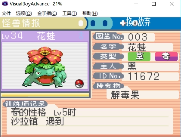 作为初始可选的三只宠物之一,妙蛙花是草属性精灵,同时也是叶绿版本的代表性宝可梦,它对岩石系和水系的怪物能起到有效的克制作用。到了后期,它可以掌握的技能有烈焰阳光、叶子切、藤鞭和吸收等。
