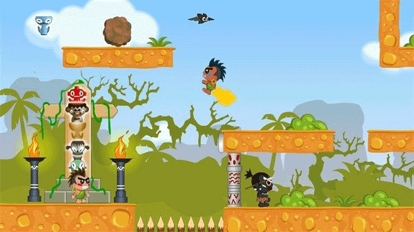 取回宝物后跳下来往回走,把宝物放回祭台,要是一个人动作慢的话可以先稍等片刻。要是争抢着往前赶路,另一个人在后面扯着后退也走不动,看图片就能明白。可以先吃点地瓜等一等。把宝物放回祭台后就继续向右前进。到了这个地方记得别跳到水里,不然会损失一条命,总共只有3条命,没命了就得重新玩。跳下来的时候不放屁也行,直接一路往前走就可以了。