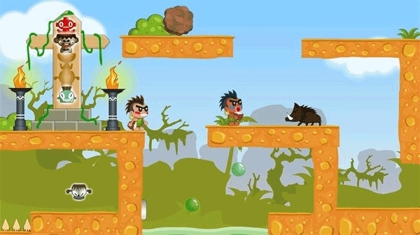 一人前往右侧拱洞下方吃掉那个红色宝物,另一人则去取左上角的宝物——可以靠连续放屁两次飞上去,或者先跳到右侧台阶再往左边移动。把宝物放回原处后,跳上台阶向右走;从图册能看到这里有野猪活动,所以得多加小心。要是想不碰到野猪轻松通过,不妨先稍作等待。等野猪往右走时,跳下去在它后面跟着向右移动,但别跟得太近,万一野猪突然回头就危险了。等野猪回头时,就放屁往右侧飞。右侧的场景如图所示,要是放屁技巧不错,能直接从左侧台阶往右飞的话,就能避开野猪;不过要是放屁功夫还没练到家,那就别勉强了。