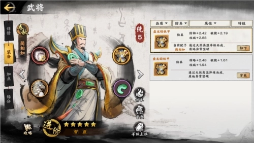 每件装备都带有不同的属性,同时装备所提供的属性加成是随机生成的。包括武力、防御、谋略、敏捷、政治及攻城。合理的进行装备搭配,会让武将的能力大幅提升,切记不要“武力英雄穿谋略装备”哦,这样是基本没有什么效果的。