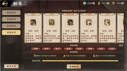 当主城等级达到9级并且解锁了马厩之后,就可以前往马厩,通过消耗基础资源驯马获得马匹。