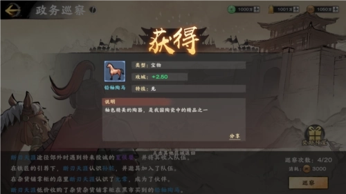 当主城等级达到8级并且解锁了政务台之后,就可以前往政务台,通过消耗基础资源政务巡查获得宝物。