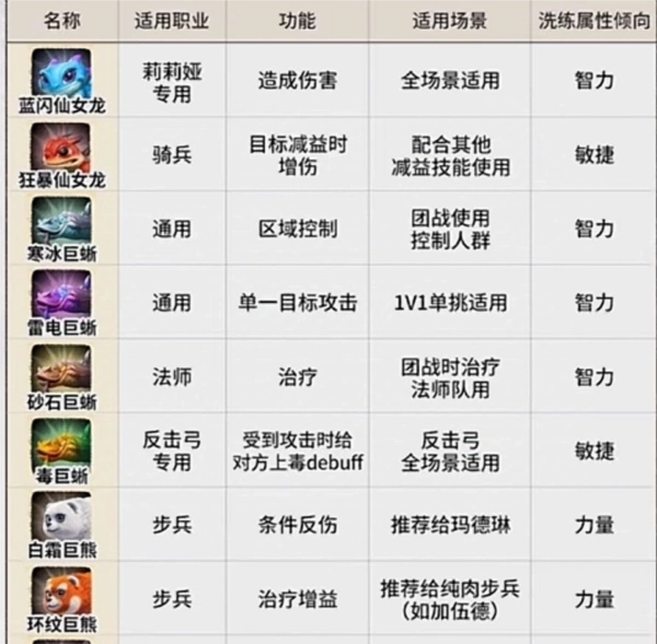 目前游戏内共有10种宠物,它们不仅有强度差异,稀有度越高可携带的技能数量也越多;同时宠物还划分兵种类型,不同宠物对应着不同的兵种属性。话不多说,直接上图↓↓↓