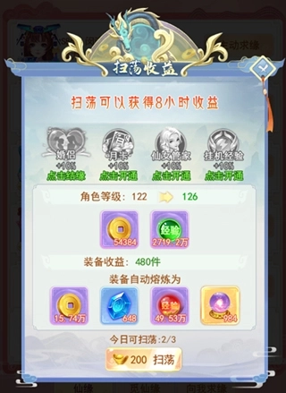 3、元宝扫荡:玩家积攒的经验和金币收益支持扫荡功能,每天可进行三次,开通SVIP还能额外增加扫荡次数哦~
