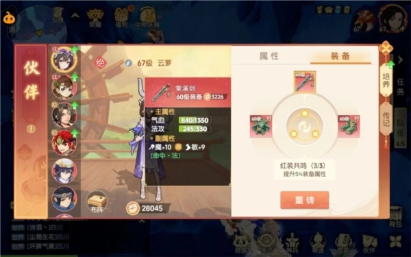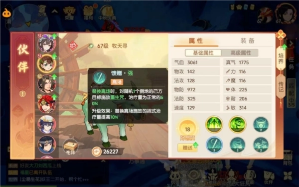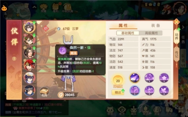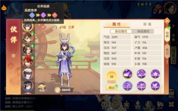 伙伴和人物类似,具备基础属性、附加属性与高级属性。其中,基础属性和高级属性主要源自伙伴天赋与装备:基础属性对应伙伴自身天赋(如攻击、防御、速度等);装备则为伙伴提供附加属性(属性点)和高级属性(像封印命中、暴击率等),且附加属性会叠加到伙伴的基础属性之上。